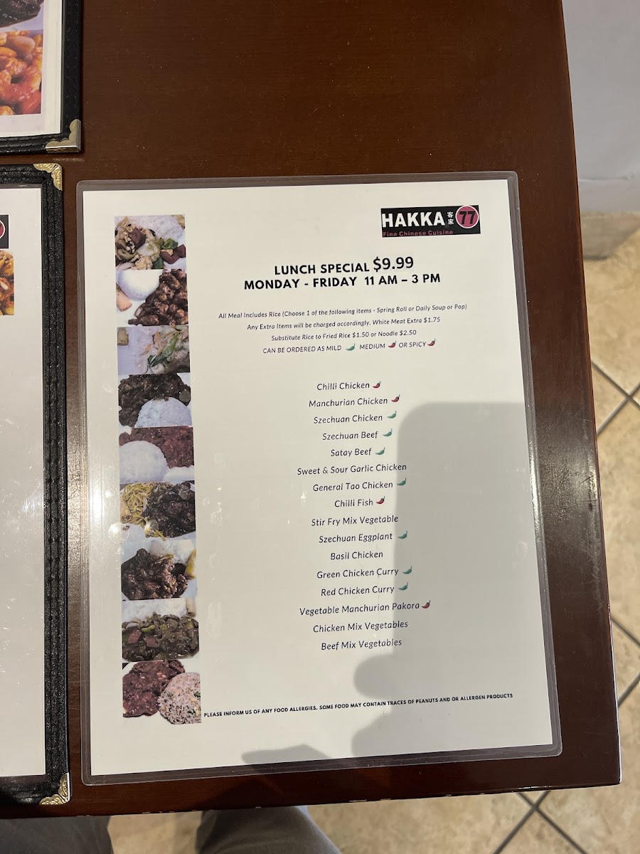 Guests can expect hearty favorites like Manchurian Chicken, Hakka Noodles, and Chicken Fried Rice alongside options such as Szechuan Crispy Dry Beef or Veg Manchurian Gravy. These dishes reflect a blend of classic Hakka and broader Chinese flavors, suited to those seeking both spice and subtlety.